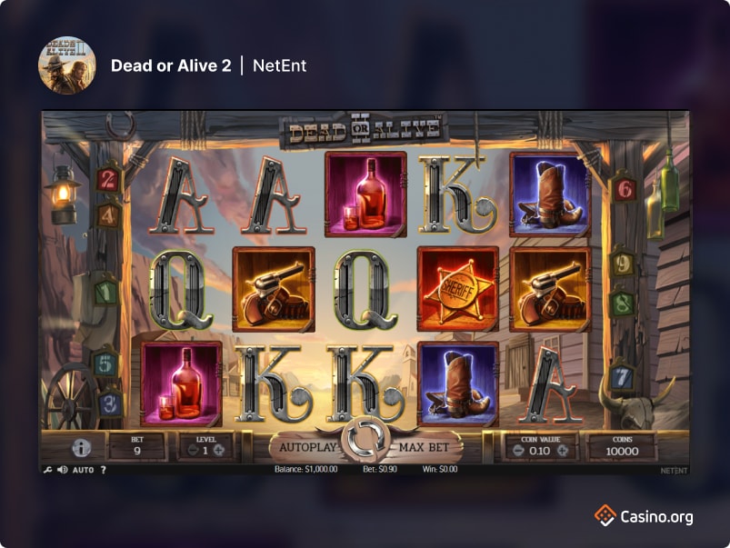 Dead or Alive 2 bénéficie de meilleurs graphismes, d'une jouabilité plus fluide et d'une bande-son plus immersive que son prédécesseur. La machine à sous dispose de 5 rouleaux avec 9 lignes de paiement et un énorme gain maximal potentiel de 111 111 fois votre mise. Elle propose également 3 jeux bonus avec différents niveaux de volatilité : Train Heist (volatilité basse), Old Saloon (volatilité moyenne) et enfin High Noon Saloon (volatilité élevée).