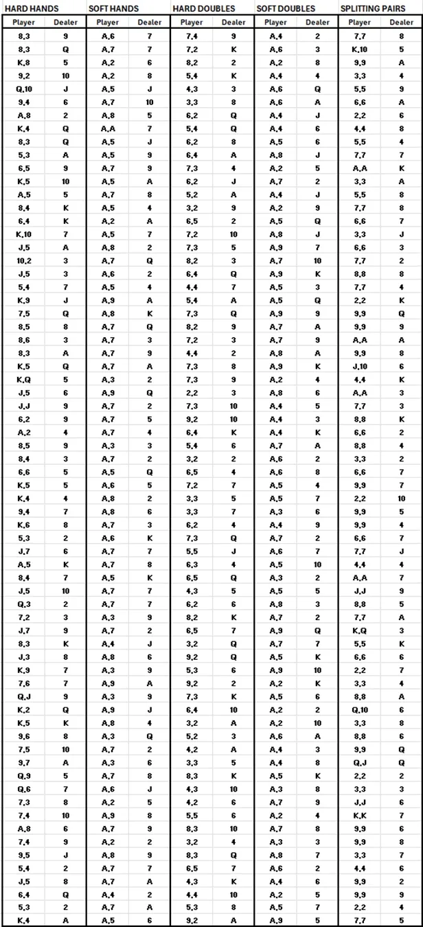 Wichtig zu merken: Ein Kartenpaar gilt auch als harte Hand. Das bedeutet, dass du in jeder Situation, in der kein Split empfohlen wird, der Strategie für harte Hände folgen solltest, also entsprechend den vorherigen Tabellen entweder ziehen, stehenbleiben oder verdoppeln.