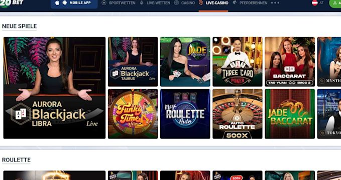 Im 20Bet Live Casino haben österreichische Spieler Zugang zu einer breiten Palette von Live-Casino-Spielen. Diese beinhalten klassische Tischspiele wie Blackjack, Roulette und Baccarat. Zusätzlich bietet das Casino auch einzigartige Live-Varianten wie Dream Catcher, Monopoly Live und Lightning Roulette. Die Live Casino-Spiele im 20Bet Casino vermitteln eine authentische Casino-Atmosphäre durch den Einsatz professioneller Dealer und interaktiver Funktionen. Die Live-Casino-Software gewährleistet einen reibungslosen Ablauf und ein ansprechendes Spielerlebnis.Unsere 20Bet Studio-Empfehlung: Schon vom Spielehersteller Novoline gehört? Gegründet von Johann F. Graf im Jahr 1980, begann Novoline zunächst als Hersteller physischer Spielautomaten in Österreich, bevor er sein Geschäft auf Deutschland, Frankreich und die Schweiz ausweitete. Ein Meilenstein war 1984 die Einführung des Admiral-Spielautomaten, der mit seinem innovativen Design punktete. Bald darauf betraten Novoline Casinos den Online-Glücksspielsektor und Spiele wie das weltweit bekannte Book of Ra Deluxe betraten wurden zum Leben erweckt. Insgesamt kannst du über 500 Novoline Titel testen, die alle auch mobil über Android und iOS verfügbar sind.Zahlungsmethoden im 20Bet Casino