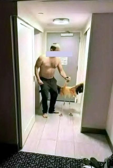 The video allegedly shows Fairbarn tucking Peachy under his shirt and jacket, then boarding an elevator with another man. (Fairbarn was the only person charged.) After exiting the elevator on the 14th floor, police said he laughed and announced, “I’m taking it home.”