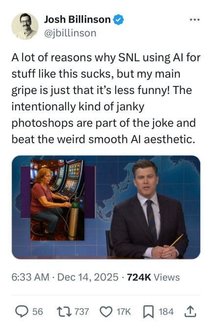 Josh Billinson, a senior social media editor at Semafor, tweeted that the gag fell flat because “SNL” abandoned its trademark “bad Photoshop” aesthetic. “The intentionally kind of janky photoshops are part of the joke,” he explained.