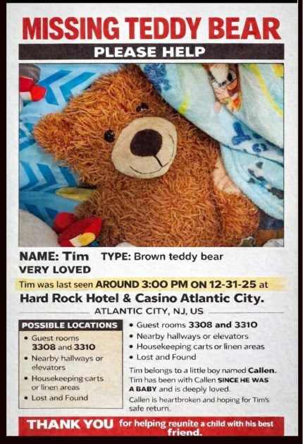 After a heartbreaking social‑media plea from a mom whose autistic 9‑year‑old son lost his cherished teddy bear, the Hard Rock Hotel & Casino Atlantic City — where “Tim” was last seen during a New Year’s Eve family trip — has stepped up with a heartwarming show of support.