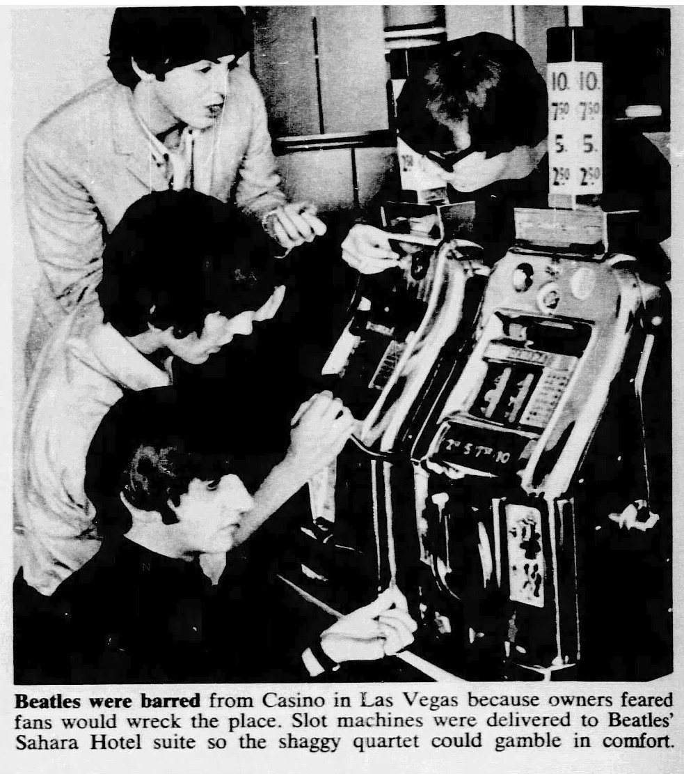 So, on the morning of the show, the Sahara brought gambling to the Beatles. In Suite 2344 of the Sahara’s Alexandria Tower, the Fabs tried out two slot machines as they clowned around for invited photographers and reporters.