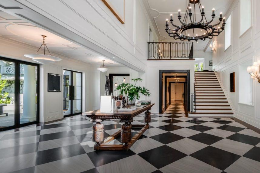 Among the many amenities are an outdoor pool and spa with a pool house, an outdoor dining area with an al fresco kitchen, several garages capable of accommodating 11 cars, a game and billiards room, a cigar room, a wood-paneled wine room, a theater, and a fitness center.