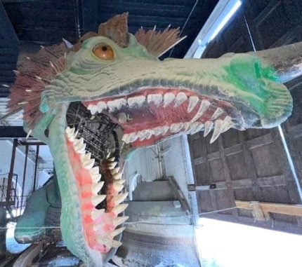 Built by AVG Productions, the rubber dragon was 71 feet long, had glowing yellow eyeballs and moved along tracks laid at the bottom of the moat. They nicknamed him Murphy, after Murphy’s Law, since everything that could wrong with him mechanically, did.