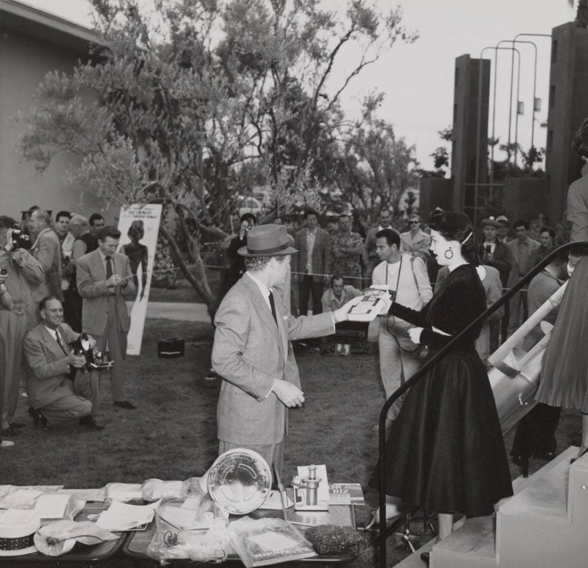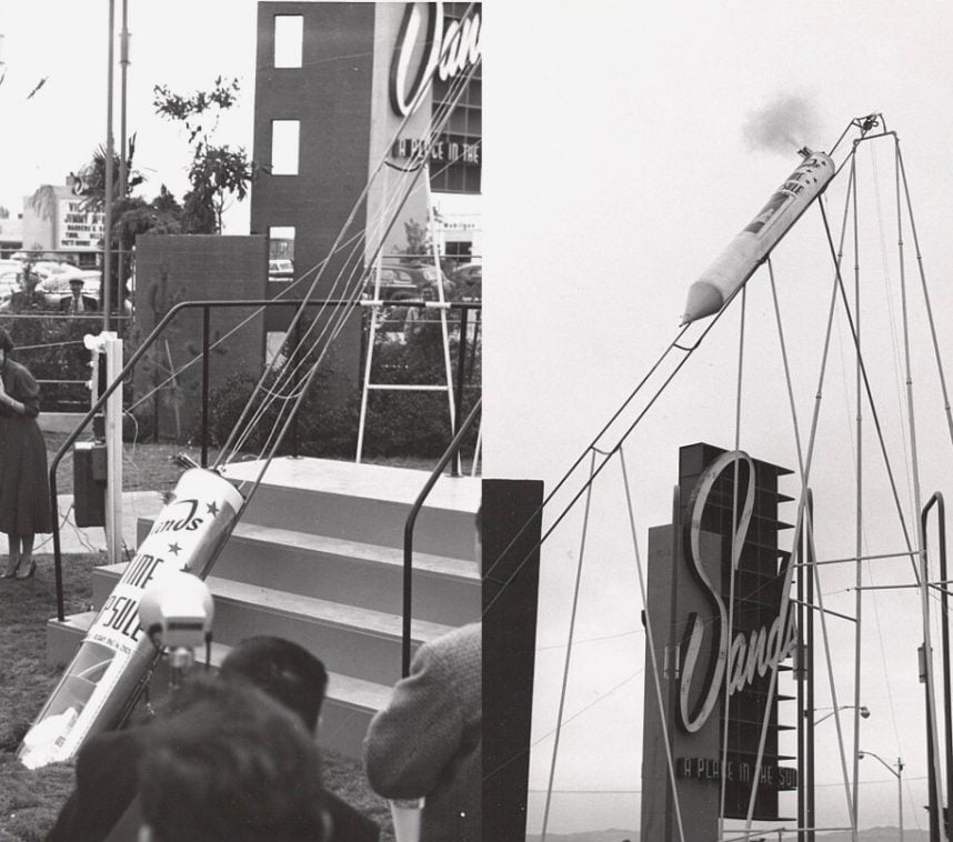 Las Vegas’ first time capsule — buried Dec. 15, 1953 — celebrated the first anniversary of the Sands. Entertainment director Jack Entratter, known for his outsized sense of spectacle, had it built as an 12-foot faux rocket to suggest its voyage into the future. It slid down a custom-built guide rail directly into its eventual burial spot on the front lawn.