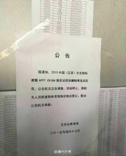 “Due to the APPT Nanjing Millions tournament being suspected of illegal gambling, the police are now investigating and the event is being ceased. All related staff should go and register at the designated location and co-operate with the police for the investigation.”
