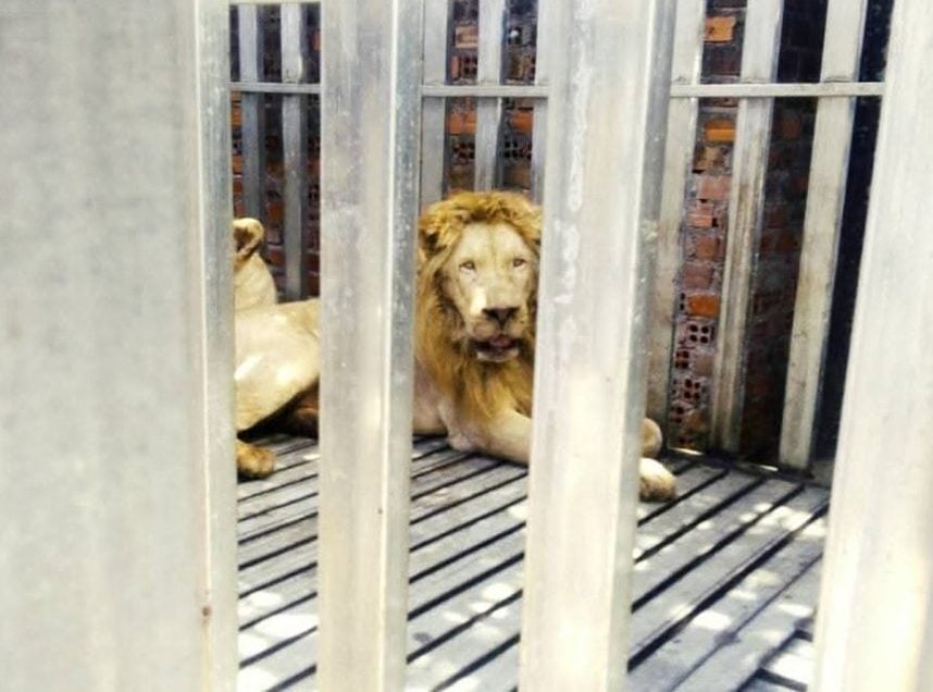 The animals — two lions, two Asiatic black bears, and one sun bear — were found locked in rusted cages inside the abandoned Thmor Da Casino compound, dehydrated and severely malnourished after being left without food or water potentially for weeks.
