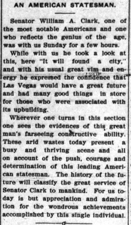 “Senator William A. Clark, one of the most notable Americans and one who reflects the genius of the age, was with us Sunday for a few hours,” it reads, referring to November 19, 1905. “While with us he took a look at this, here ‘It will found a city,’ and with his usual great vim and energy he expressed the confidence that Las Vegas would have a great future and had many good things in store for those who were associated with its upbuilding.”