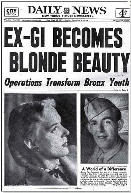 Jorgensen was the first transgender celebrity in the US. The former G.I. from the Bronx became famous after undergoing gender reassignment surgery in Denmark, which was illegal in the US when she began the process in 1951. The New York Daily News received a tip about her story and ran it front page on Dec. 1, 1952.