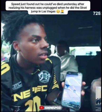 “IShowSpeed almost unalive last night as a piece of his bungee cord snapped mid-fall!” claimed the TikTok channel @dz1Sfylef0.