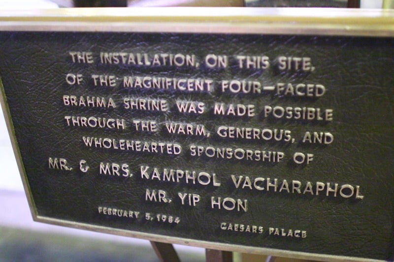 The shrine is a replica of one of Thailand’s most popular shrines found at Bangkok’s Grand Hyatt Erawan Hotel. It was donated to Caesars Palace in 1984.