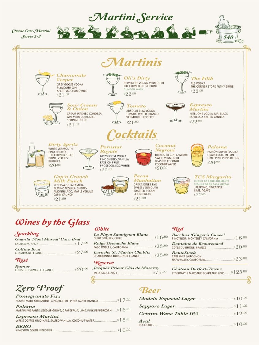 Here’s a blurb from The Corner Store about its cocktail program: “We have a culinary approach to our cocktail program, using techniques like infusion, cryovac, sous vide, milk washing and oil washing and tools like a refractometer to dial in sugar levels. Like a scratch kitchen, we make all ingredients in-house—from juicing citrus daily to making fresh grenadine—the only ingredient that comes out of a bottle at The Corner Store is the liquor. Our program features creative twists on classic cocktails, with the martini at its core. Some highlights include an umami-forward Tomato Martini, a dill-infused Sour Cream & Onion Martini, and a tableside martini service for a Dirty Martini tasting experience of our Oli’s Dirty Martini and The Filth Martini—both brines made in-house. All of our martini recipes are precisely refined to the exact weight and percentage of water dilution, and then stored in our zero-degree Fahrenheit freezers delivering a perfectly chilled martini every time.”