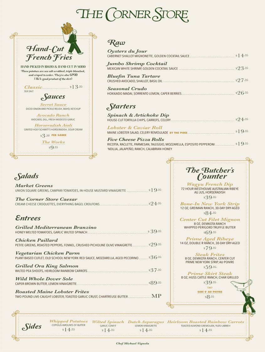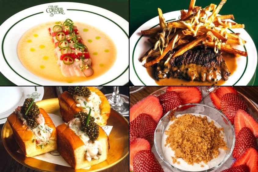 Here’s what Corner Store says about its menu: “Our menu is straightforward, yet nostalgic, and inspired by the things people know and love—such as Spinach & Artichoke Dip, Caesar Salad with crispy cream cheese and everything bagel croutons, Lobster & Caviar Rolls, Wagyu French Dip with steaming au jus poured tableside, French Fries with our own secret sauce, and a Samoa Sundae & Apple Hand Pies for dessert.”