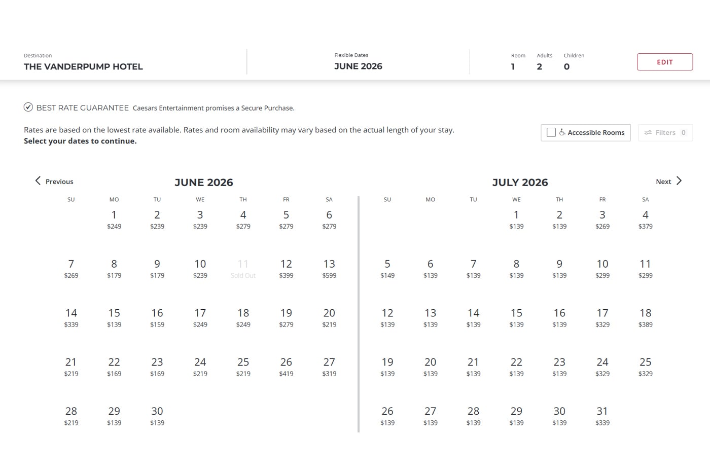 We checked out the initial dates for Vanderpump Hotel, and rooms run in the $500 range at reopening, but settle into the more typical rates you’d expect from a casino in a prime location on the Las Vegas Strip.