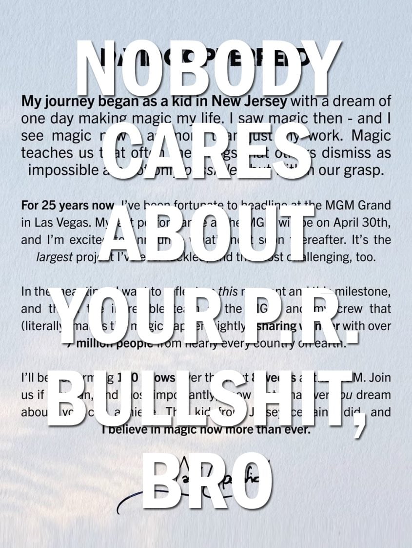 Basically, Copperfield blathers on about his “journey” and his show is closing and he’s excited to announce what’s next, the largest and most challenging project he’s ever tackled and how he’s going to do 120 shows in eight weeks to squeeze every last dollar out of his last gasp in America because his next project will definitely be overseas where everyone pays in cash which is definitely on the up-and-up.