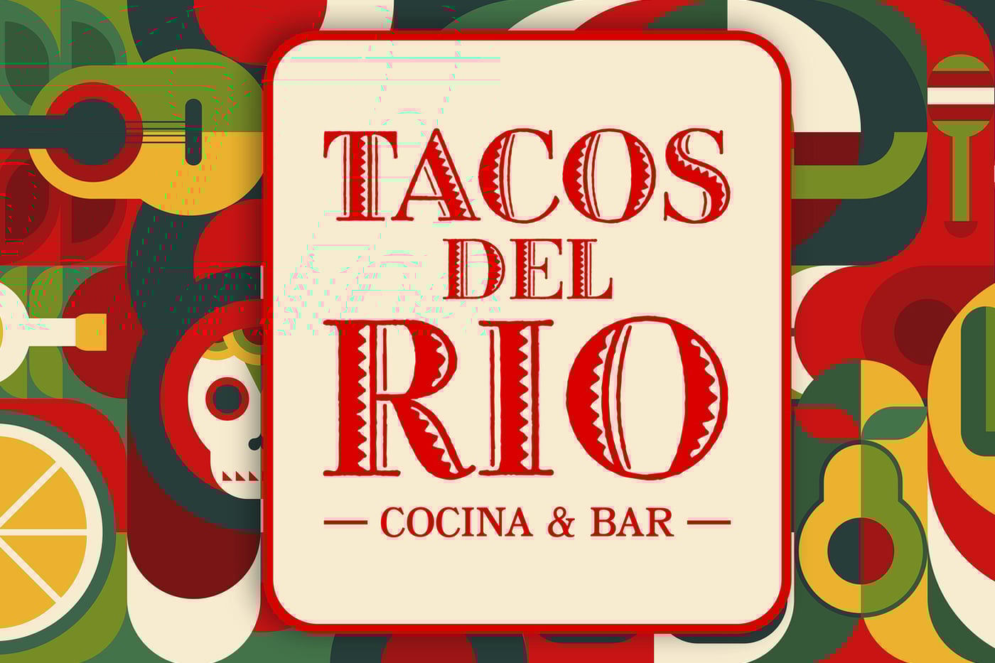 The Tacos Del Rio artwork features maracas, a taco, a lime slice, an avocado, a chili pepper, a bottle, a striped margarita glass, a guitar, a cactus and a sugar skull.