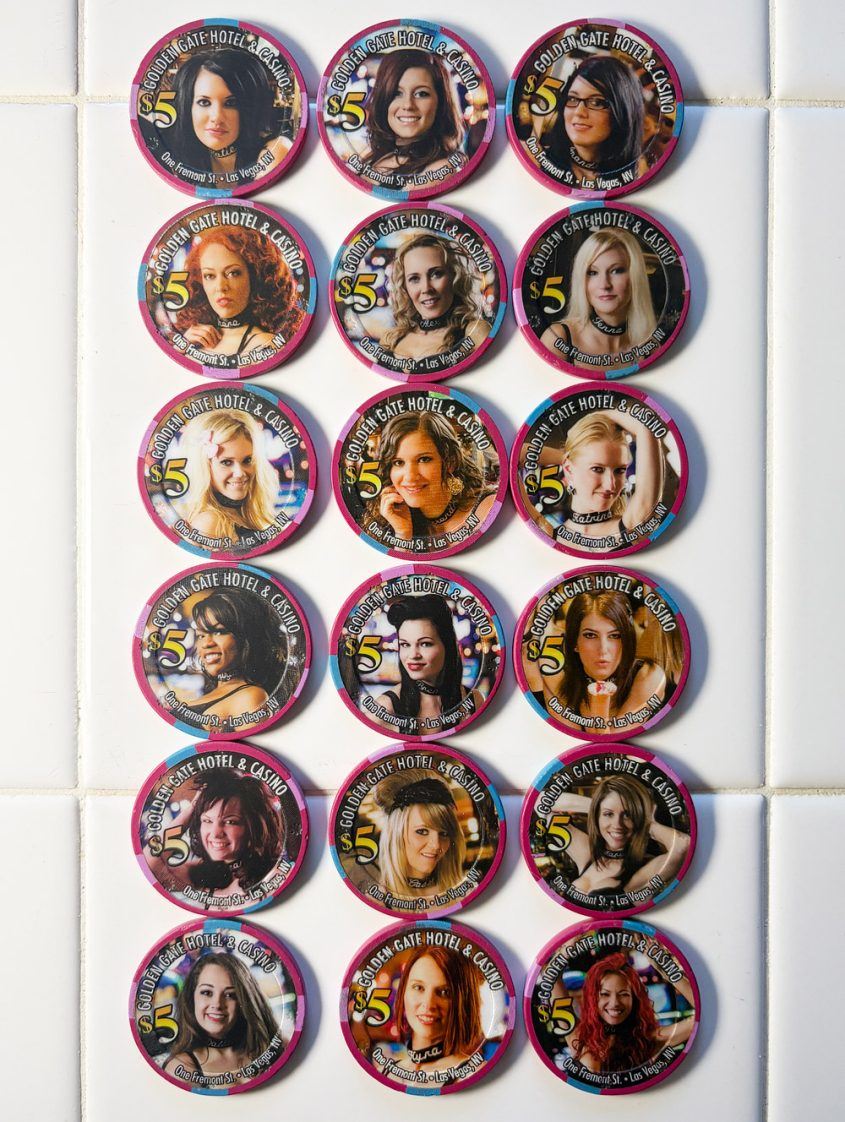 Before live table games went away at Golden Gate, we snagged a collection of all the chips with dancing dealers. There were 18 chips, so the set cost $90. It is now one of our most prized possessions. Just one of the dancing dealers was depicted on two chips. We would tell you which dancing dealer, but then we would not know more about Las Vegas than you, and we are having none of that.