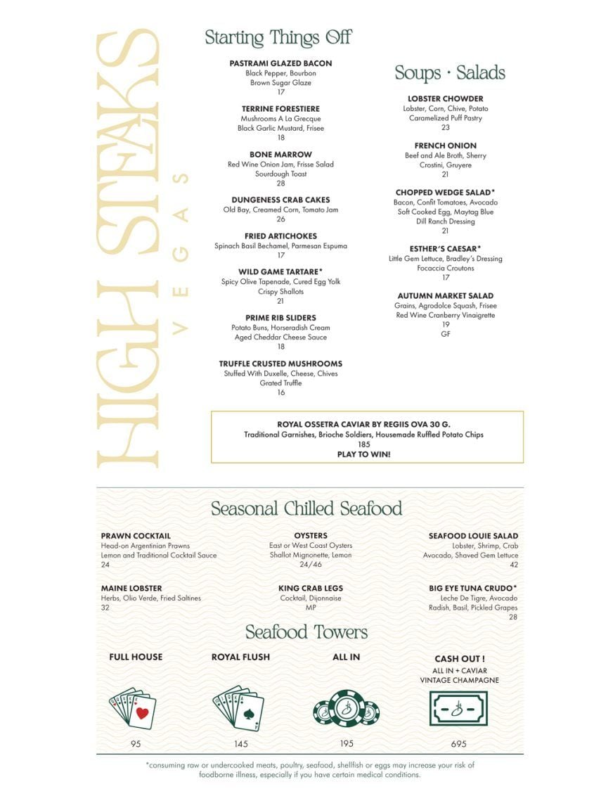 The High Steaks menu includes pastrami glazed bacon, wild game tartare, lobster chowder, chopped wedge salad and seasonal chilled seafood towers.