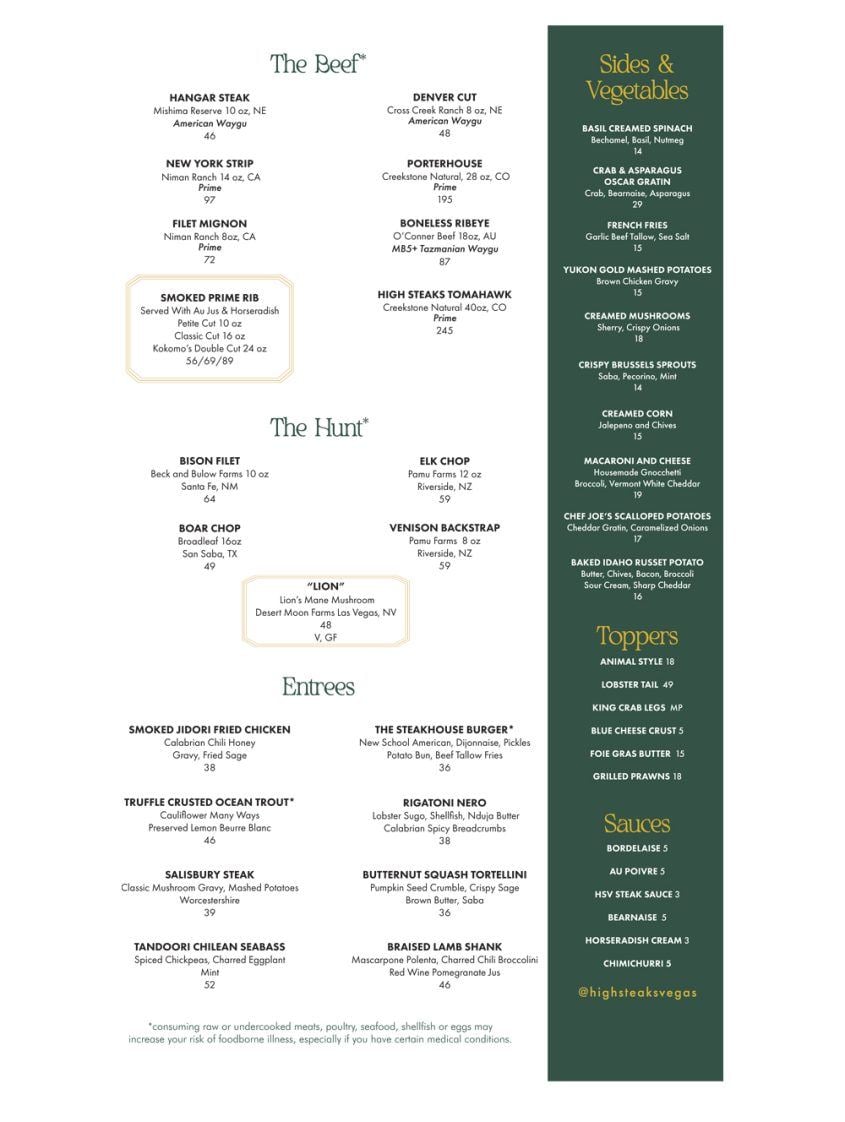 Steaks range from a 10-ounce Nebraskan Mishima Reserve hanger steak ($47) to signature smoked prime rib and the show-stopping High Steaks Vegas-branded 40-ounce prime tomahawk ($245).