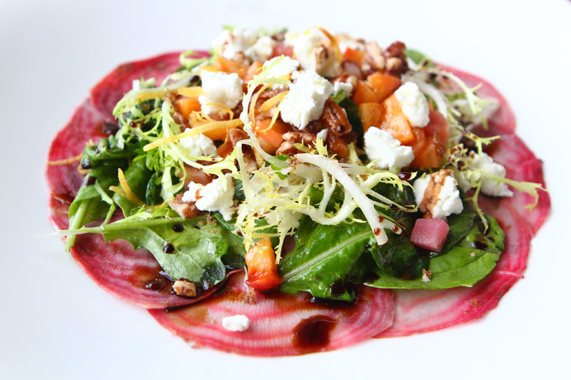 Next, we tried the Candy Striped Beet Carpaccio, with peaches, candied pecans and goat cheese.